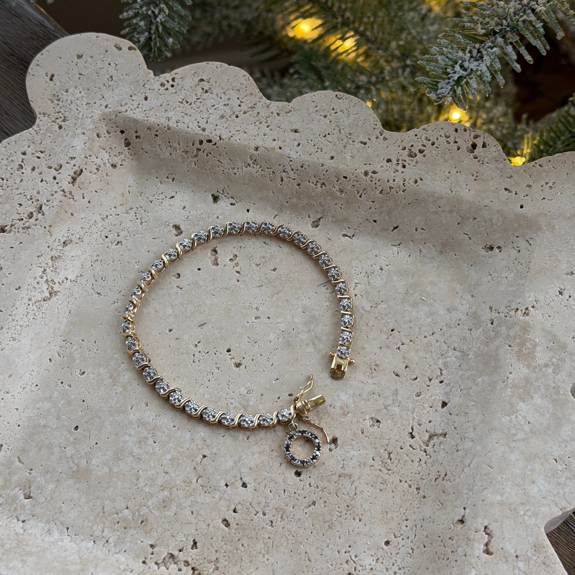925 gold swirl and silver circle tennis bracelet with silver and blue circle charm