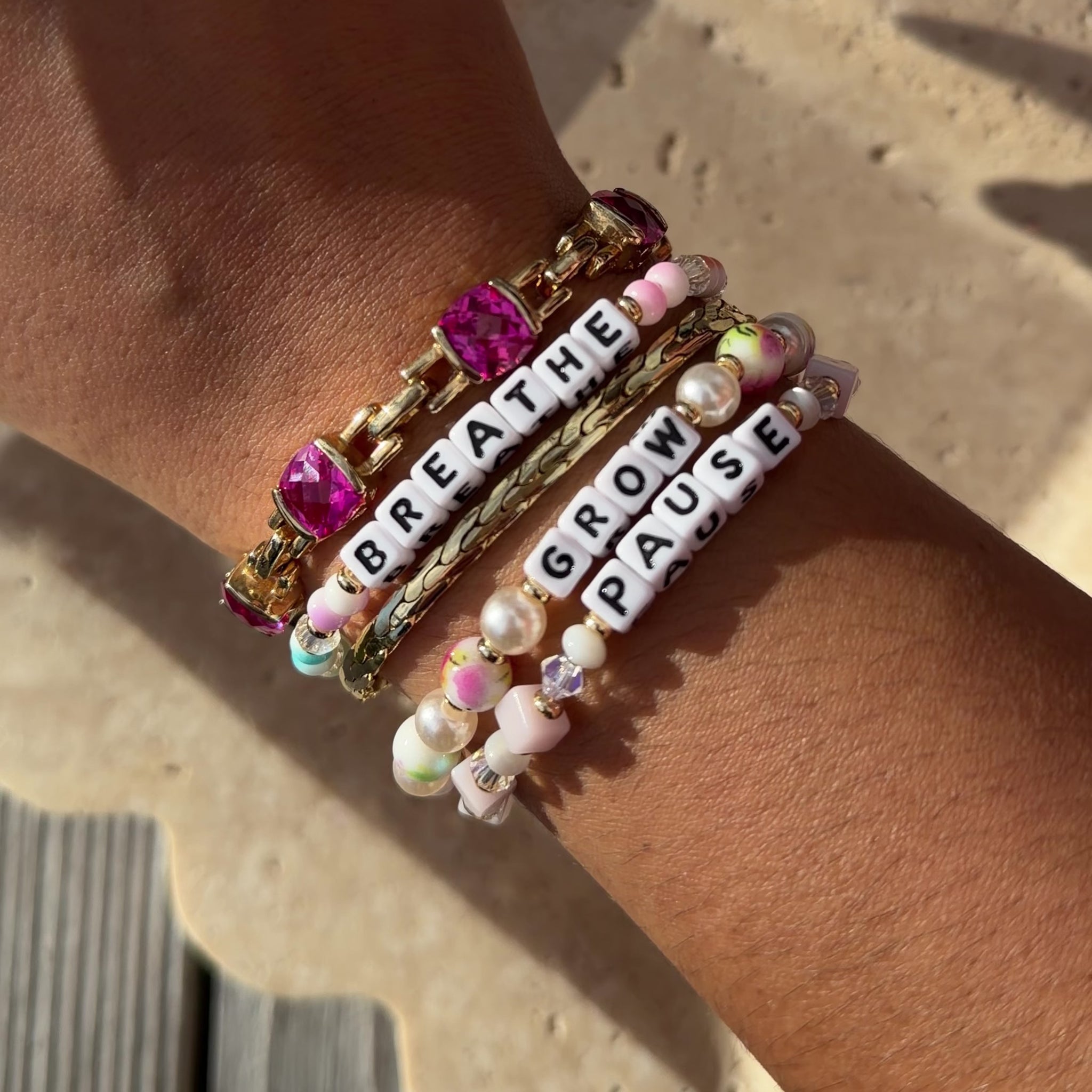 Heart Pieces: Gold Vermeil Pink CZ Cushion-cut Bracelet - 7",Gold Tone Snake Chain- 7" Little Words Project: Breathe - SM, Grow -SM, Pause- SM Items are unique and vintage- please handle with care and shop responsibly.</p> <p> All sales are final! </p> |